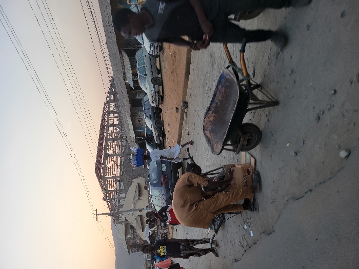 People are working on a street corner with construction visible in the background. Several individuals are positioned near a wheelbarrow and what appears to be a small machine. Parked vehicles line the street. A male walks by the wheelbarrow. Overhead powerlines crisscross the sky, indicating infrastructure. The lighting suggests either sunrise or sunset. The setting appears to be a bustling, active area.