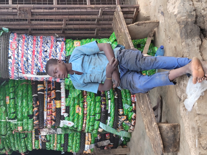 A young man sleeps on a platform surrounded by tires. He wears a blue shirt and pants, a gold bracelet visible on his wrist. The tires are stacked vertically, some wrapped in green and red packaging. A plastic water bottle and a white plastic bag are near his feet on a concrete floor. A rough wooden structure forms part of the platform.