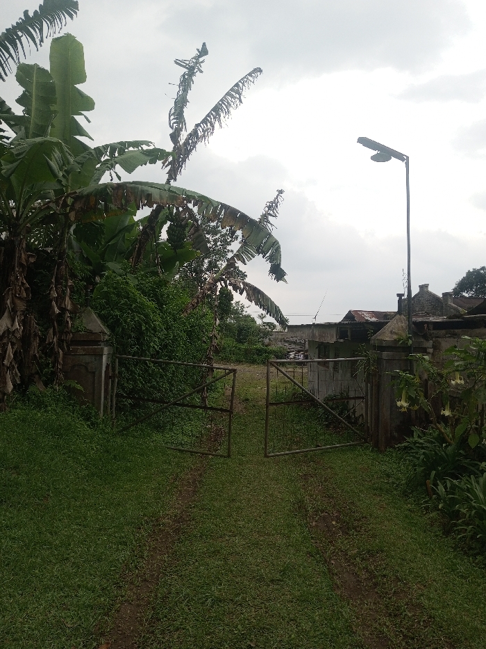 The image depicts an open, two-panel, dark metal gate situated at the entrance of a grassy, unpaved area in Ciherang, Indonesia. The gate is flanked by two stone pillars, one partially obscured by dense vegetation on the left and another on the right. A dirt path or tire tracks lead through the open gate into the distance, where a collection of structures with corrugated metal roofs and walls are partially visible under an overcast sky. To the left of the gate, multiple large banana trees with both healthy green leaves and some dry, damaged foliage dominate the foreground, with unripe banana bunches evident on one tree. Dense green undergrowth covers the ground beneath the banana trees and extends to the left gate post. On the right side, a tall, dark street light pole with a single luminaire stands prominently, extending above the visible structures. Below the street light and near the right gate post, dark green foliage is present, punctuated by several drooping white or pale yellow trumpet-shaped flowers. The foreground consists of overgrown green grass with clear dirt tracks. No individuals or active interactions are present in the scene.