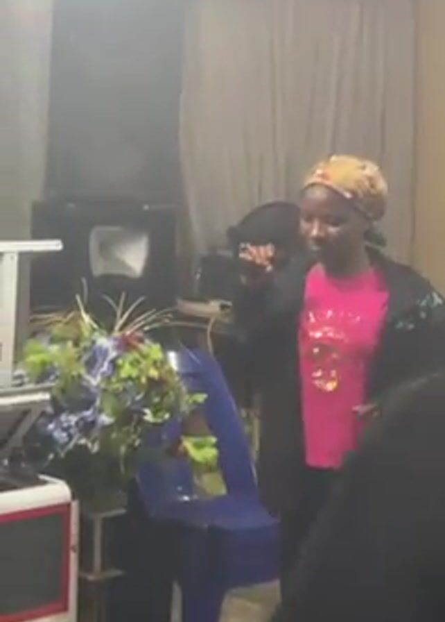A woman is singing into a microphone in what appears to be a small indoor venue. She is wearing a head wrap, a pink T-shirt, and a black jacket, with a dark skirt. Behind her, there is a tall speaker, a table, and a blue plastic chair. The room is decorated with flowers and other decorative items. There are other people present in the room, although they are partially obscured from view. The woman is actively performing, suggesting a religious gathering or performance.