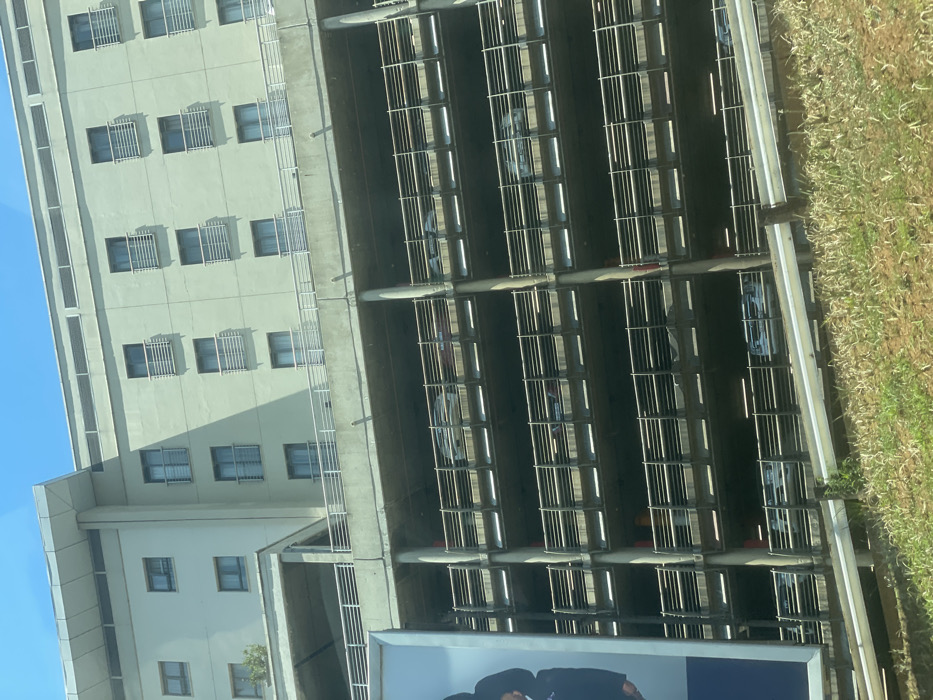 The image depicts a multi-story building complex in Kempton Park, South Africa, consistent with the architecture of the City Lodge Hotel Group properties near O.R. Tambo International Airport. The scene features a modern, pale beige or light grey multi-story building with a flat roof, comprising at least seven visible floors. Each floor contains multiple rectangular windows, many equipped with small, grey horizontal-barred balconies. Shadows are cast on portions of the building, indicating bright daylight. Directly beneath the main building is a concrete multi-level parking garage, at least five levels of which are visible. Each level of the garage is secured by horizontal metal railings. Numerous passenger vehicles, including light and dark-colored sedans and SUVs, are parked within the structure on various levels. Vertical concrete pillars support the parking garage. On the far left, a large billboard or sign is partially visible, displaying the torso of an individual, likely male, wearing dark formal attire. The foreground of the image shows a grassy embankment with dry, light-colored vegetation. A silver metal guardrail runs horizontally across the lower section of the frame, positioned between the grassy area and the parking structure. The sky above is clear and blue. No individuals are visible performing actions or interactions within the scene.