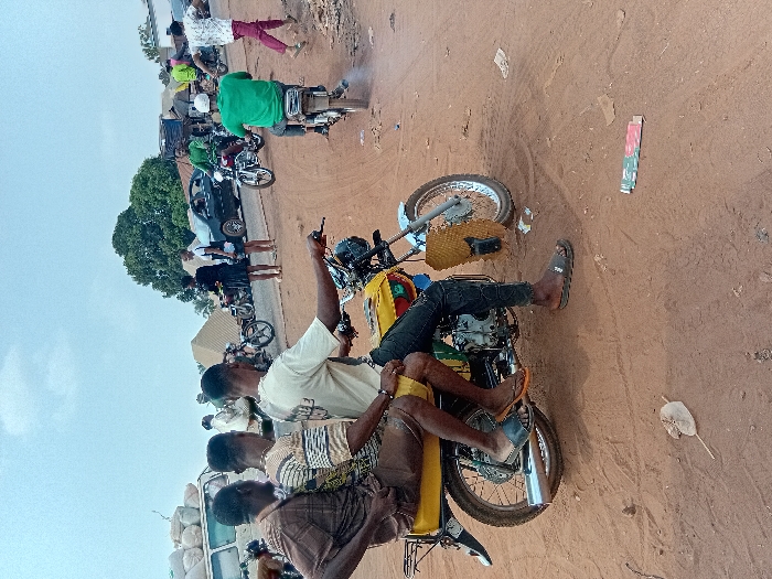 The scene depicts a busy unpaved thoroughfare or intersection in Tuaniako, Nigeria, under an overcast sky. In the immediate foreground, three adult males are seated on a yellow motorcycle, facing right. The operator, wearing a light-colored short-sleeved shirt, dark pants, and dark flip-flops, grips the handlebars. The middle passenger wears a striped short-sleeved shirt, dark shorts, and light-colored flip-flops. The rear passenger wears a brown patterned short-sleeved shirt, dark shorts, and dark flip-flops. The motorcycle is yellow with a chrome exhaust and a corrugated yellow plastic guard on the front fork. The ground beneath them is reddish-brown dirt, exhibiting tire tracks, a dried leaf, and a discarded wrapper. In the midground, various activities unfold. To the left, a white van overloaded with white sacks on its roof is parked or moving slowly, followed by a dark-colored sedan. Two females stand near the sedan, one in a dark skirt and top, the other in a white t-shirt and dark pants. Multiple other individuals and motorcycles are present. A male in a green t-shirt and white cap operates a motorcycle facing away from the viewer, with visible exhaust fumes. Another male in a white t-shirt and red pants is seen walking towards the right. The road surface in the midground transitions from dirt to a more compacted or paved area. The background includes scattered buildings, some with corrugated metal roofs, and a prominent large tree with dense green foliage.