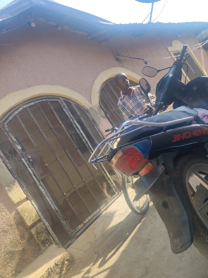 This image captures an outdoor scene in Akwanga, Nigeria, under bright daylight conditions, presented with a slight upward tilt. A young male, dressed in a red, white, and black plaid long-sleeved shirt, stands to the right of center, positioned next to a black "JINCHENG" brand motorcycle. The male has short hair and is looking slightly towards the left. The motorcycle, prominent in the foreground and midground, features a rear luggage rack, a red taillight, and an orange reflector. The brand name "JINCHENG" is visible in red lettering on the side. Behind the motorcycle and the male is a building with light pinkish-brown stucco walls and a corrugated metal roof. The building features two arched openings, possibly doorways or windows, secured with dark metal security gates. These arches are framed by a lighter, possibly yellow, trim. A light fixture is visible beneath the roof overhang. A portion of a satellite dish is visible against the bright sky in the upper right quadrant. The ground is a light-colored surface, likely concrete or packed earth, with distinct shadows cast by the motorcycle and other unseen objects, indicating strong sunlight.