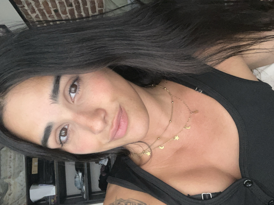 A woman with long, dark hair and striking dark eyes gazes into the camera. She has full eyebrows and a gentle smile. She wears a black tank top, exposing a glimpse of a bra strap underneath. A delicate gold necklace with star and moon charms adorns her neck. Part of a tattoo is visible on her left shoulder. A partially visible brick wall and a glimpse of an interior corner with assorted objects form the background. The image has a slightly tilted angle.
