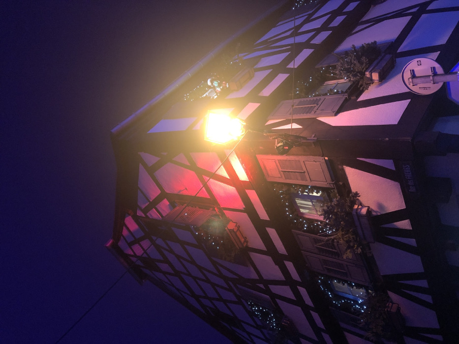 A low-angle shot captures a building façade at night, illuminated by a bright light. The structure features a traditional timber frame design with white panels. Festive lights and greenery decorate the windows. Shutters are partially visible. The night sky is a deep blue gradient. A round sign is affixed to the building's corner. The building's surface is tinted with pink hues, possibly from artificial lighting. The architecture exudes a holiday atmosphere.