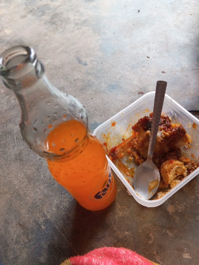 Location: Unknown, Unknown. A partially consumed meal and beverage are depicted on a concrete or paved surface. A clear glass bottle, approximately half-full of orange Fanta brand soda, stands upright on the left. To its right, a translucent rectangular plastic container holds remnants of food, including white rice mixed with a red-orange sauce and several pieces of a light-colored protein. A silver-colored spoon rests within the container, partially submerged in the food. The surface beneath these items is dirty, mottled gray concrete. In the bottom foreground, a small section of a fuzzy, bright reddish-pink object is visible. No individuals are present.