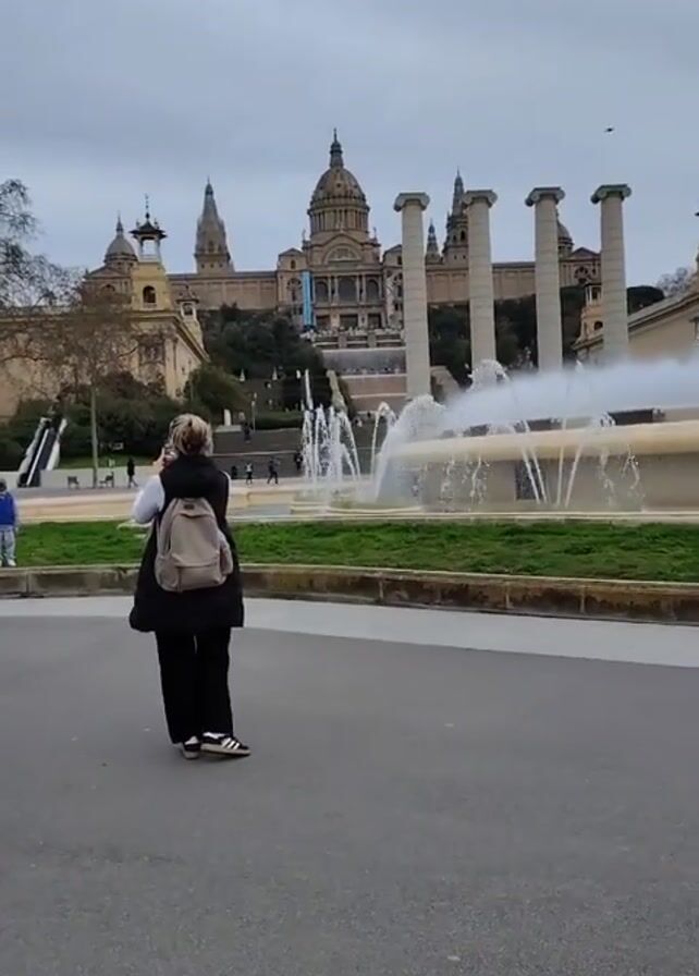 person standing in front of a large fountain with the Museu Nacional d'Art de Catalunya in the background. The person is wearing a dark vest, dark pants, and carrying a backpack. They are facing the fountain and appearing to take a photo with their phone. The fountain consists of several tiers with water jets spraying upwards and outwards. Six large columns stand behind the fountain. The museum is visible atop a hill with its distinctive dome and towers. The sky is overcast. There is an asphalt road in the foreground, and a small child is standing off to the left side.