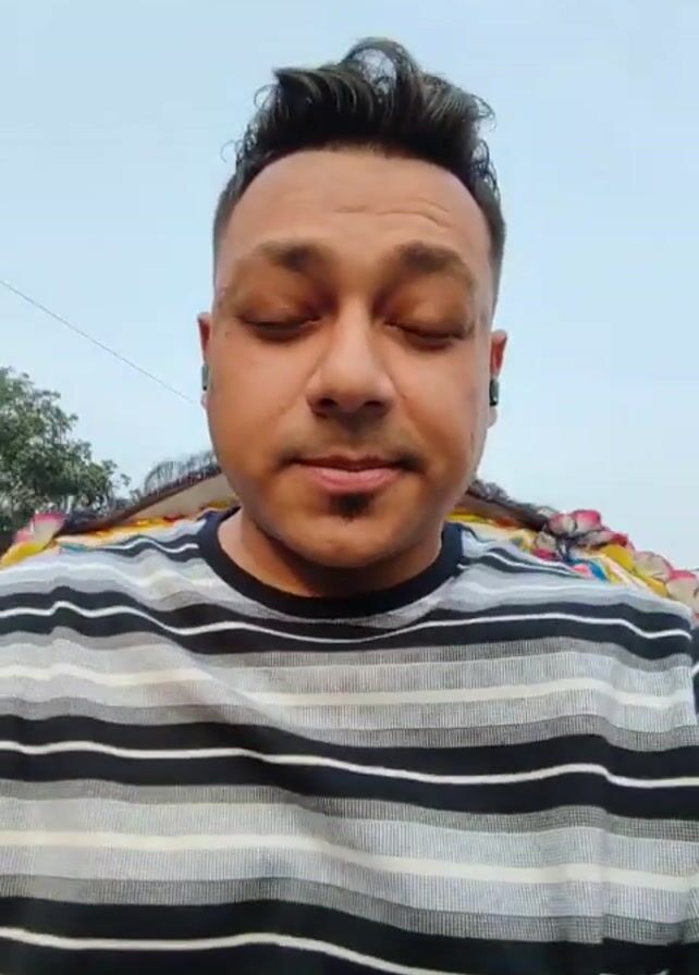 A man in a black and white striped shirt is looking at the camera with a slight smile. He has short dark hair and a thin goatee. He is wearing earbuds. Behind him is a colorful structure, possibly a decorated cart or vehicle. The sky is overcast. The man appears to be in motion.