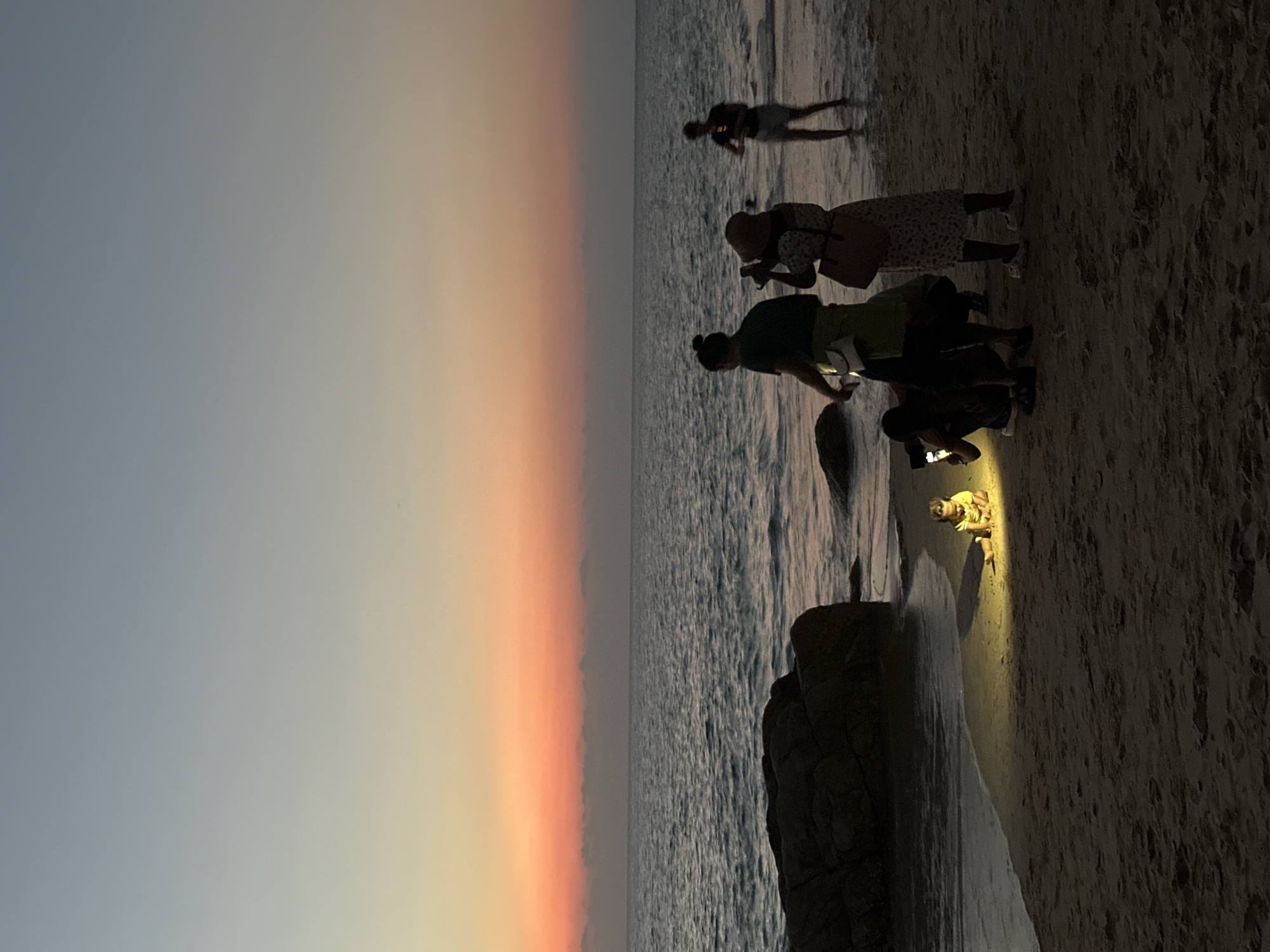 At a beach in Sakhu, Thailand, the scene unfolds at dusk, as suggested by the gradient of light transitioning from a pale blue-gray to shades of orange near the horizon. The sea is a dark gray with subtle ripple patterns, likely reflecting the fading light. A large, dark rock formation is present at the edge of the sea. Five individuals are present on the sandy beach, their forms silhouetted against the remaining light. From top to bottom: - One person is walking along the beach. - Another individual, possibly a woman, is taking a picture with a camera or phone. - Another individual appears to be taking picture of the small child with the yellow light. - A person is using a flashlight to illuminate a small child near the shoreline. The child is also illuminated by a handheld flashlight. The texture of the sand varies, appearing smoother near the water and coarser towards the edge of the frame.