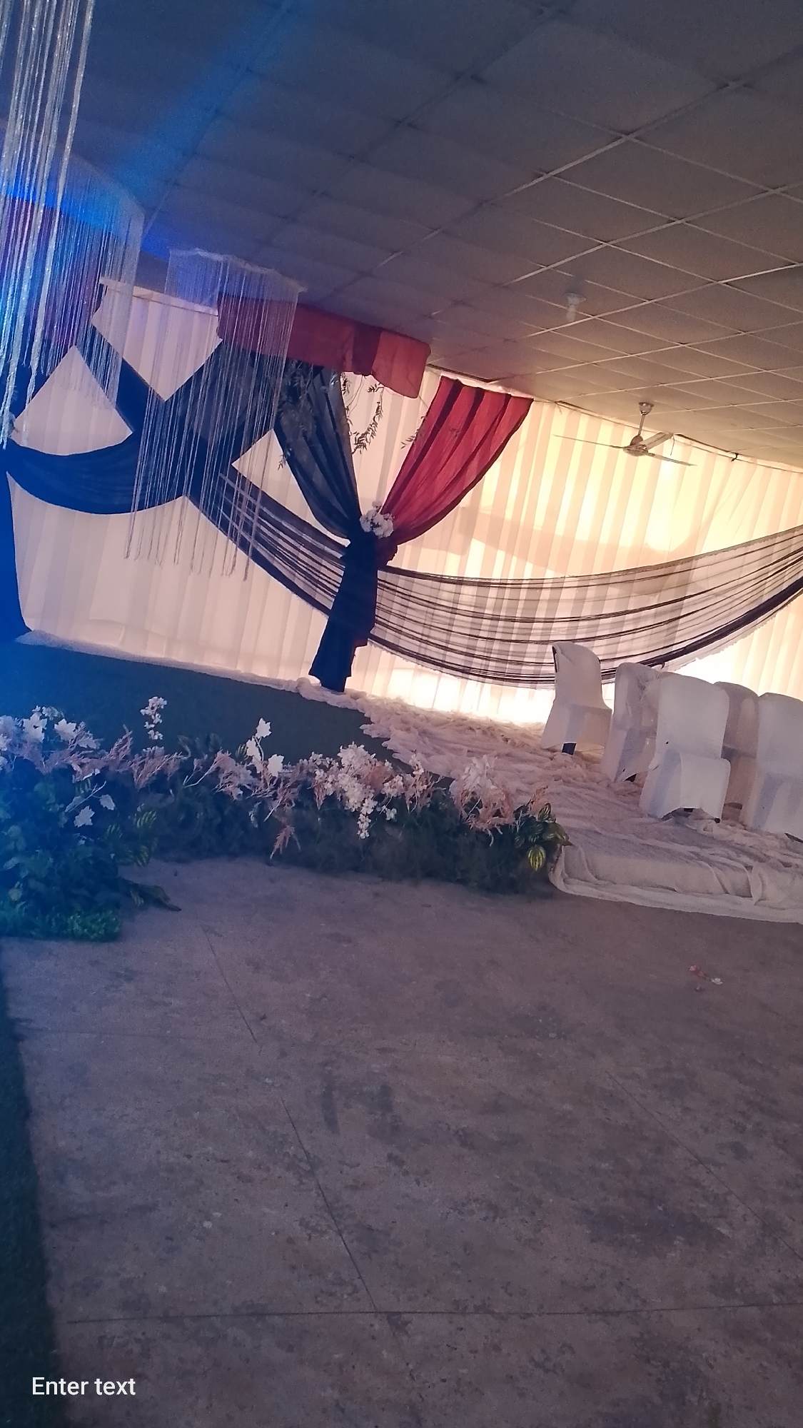 The image depicts an indoor event space in Gudi, Nigeria, characterized by ceremonial decorations