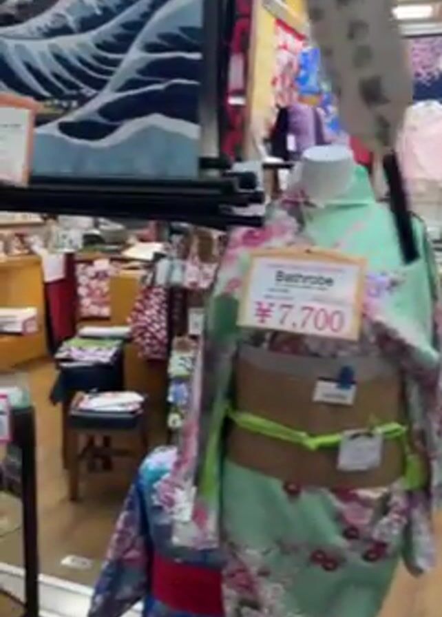 inside of a shop selling traditional Japanese items. The shop is small, with a narrow aisle running through it. On either side of the aisle are displays of kimonos, fans, paintings, and other items. A price tag on a mint green kimono shows a price of 7700 Yen. The camera pans to show a customer browsing through the merchandise. Then, the camera moves to a view of a street lined with shops. The street is crowded with people, and many red lanterns and floral decorations are hung overhead. The time is night.