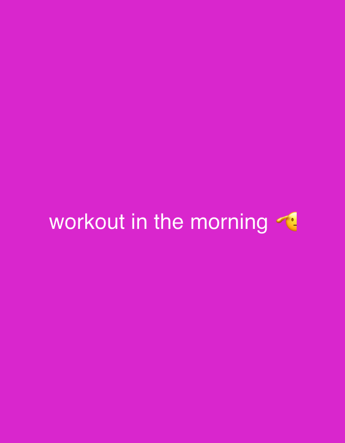 The image displays a uniform magenta background. Centered horizontally on this background, and positioned in the lower-middle section, is white sans-serif text reading "workout in the morning". Immediately to the right of the text, a yellow emoji is present, depicting a stylized head with a raised arm touching the forehead, suggesting exertion or fatigue. The depicted scene is located in Dimitrovgrad, Bulgaria. No individuals, additional objects, or discernible environmental features other than the solid color are present.