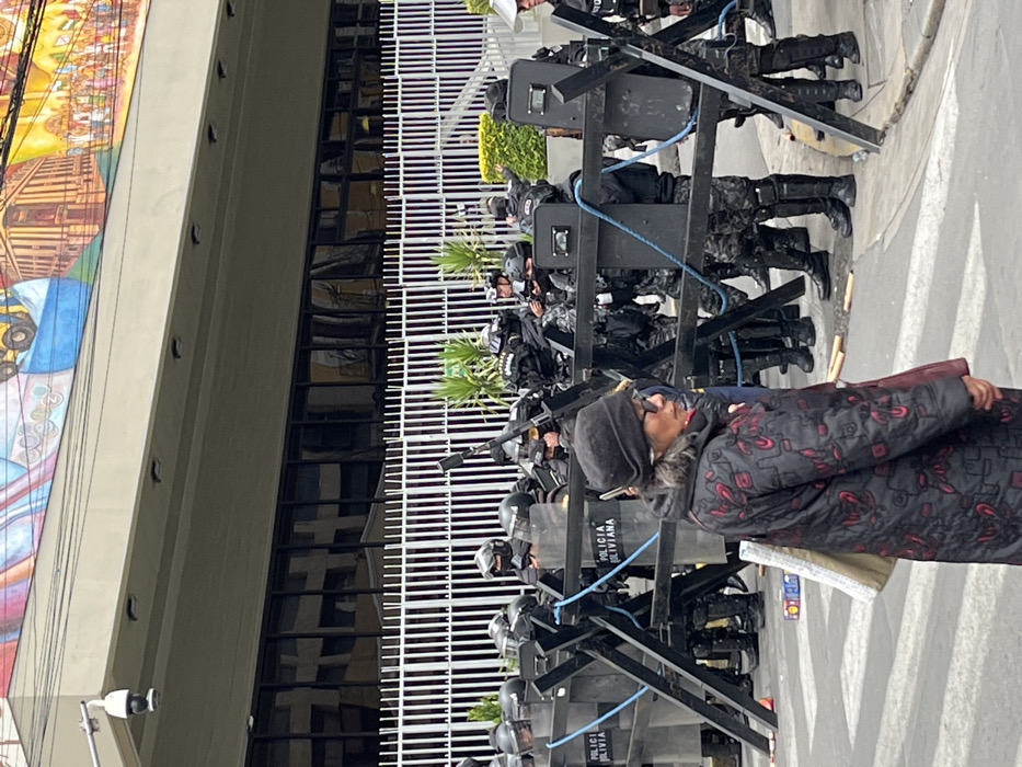 A crowd of police officers in riot gear forms a line, holding shields and batons. Behind them, a building with barred windows and a colorful mural is visible. In the foreground, a person wearing a dark, patterned coat stands with their back to the camera, holding a piece of white paper or cardboard. The scene appears tense, suggesting a protest or demonstration taking place.