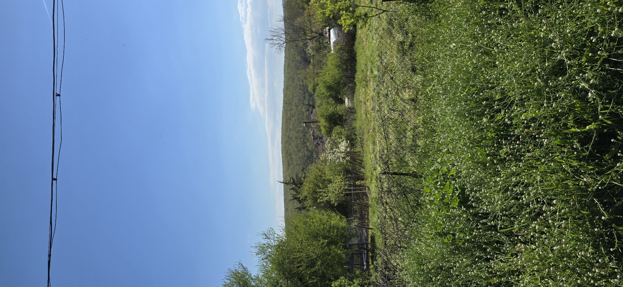 rural landscape under a bright blue sky with a few wispy clouds. Power lines are visible on the left side of the frame. The right side of the image is dominated by dense green vegetation, including grasses and wildflowers, possibly weeds. In the middle ground, there's a mixture of trees, bushes, and a wooden fence partially obscured by foliage. Some buildings, likely houses, are visible in the distance, nestled amongst the trees. The location seems to be on the edge of or within a forest area. There are no people or discernible actions visible. The scene is likely in Yasna Polyana, Bulgaria, given the location details, though specific landmarks are not clearly identifiable.