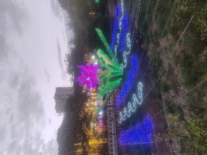 A whimsical scene unfolds with an illuminated flower display featuring pink petals, green foliage, and swirling blue and white lights. Behind the festive arrangement, a cityscape appears, topped by overcast skies. Strings of warm lights illuminate the trees and landscape in the background, contributing to a festive, almost dreamlike atmosphere.