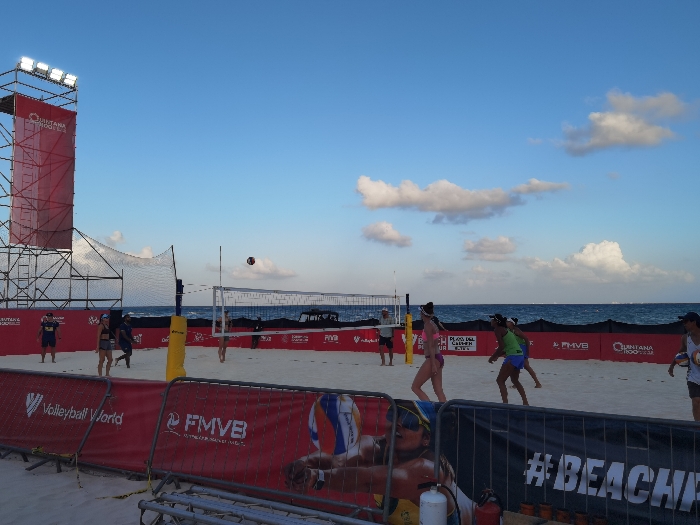 beach volleyball game in Playa del Carmen, Mexico, at the coordinates 20