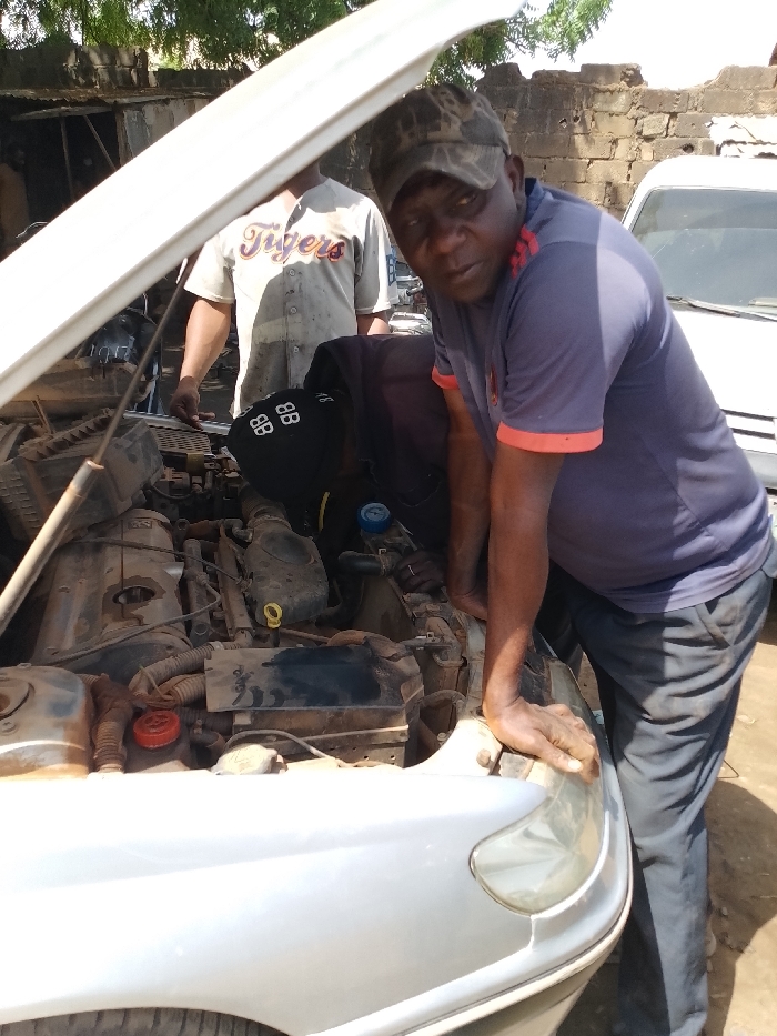 In the city of Sardauna, Nigeria, an outdoor scene depicts two men engaged with an open car engine