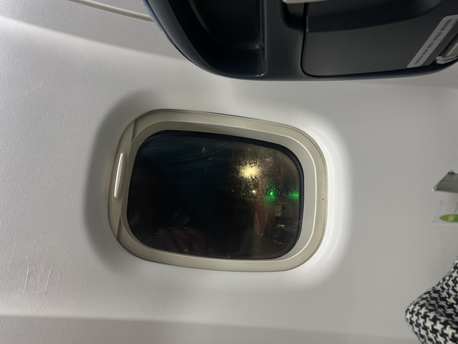 The image features a window on an airplane, viewed from inside the cabin. The window frame is light grey, and the glass is partially obscured by moisture. Through the window, blurred lights are visible, with a distinct green light suggesting the plane is on the ground. Above the window, part of the overhead compartment can be seen. The cabin walls are white. The image is slightly rotated.