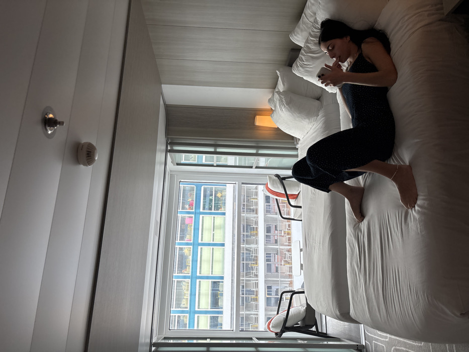 The image displays the interior of a cruise ship cabin, docked in the Berry Islands, Bahamas. A female subject lies supine on a bed, propped by white pillows, dressed in dark, patterned clothing with an anklet on her left ankle. She is holding and viewing a white-cased smartphone. The cabin features two beds with white bedding, and two dark-framed chairs with white and orange cushions positioned by a large window. A small table is between the chairs. The window offers a view of an adjacent cruise ship's decks, characterized by balconies and blue-paneled sections. A bedside lamp with an amber glow is visible on the right. The ceiling contains a white smoke detector and a chrome fire sprinkler head. Walls are light-colored and paneled.