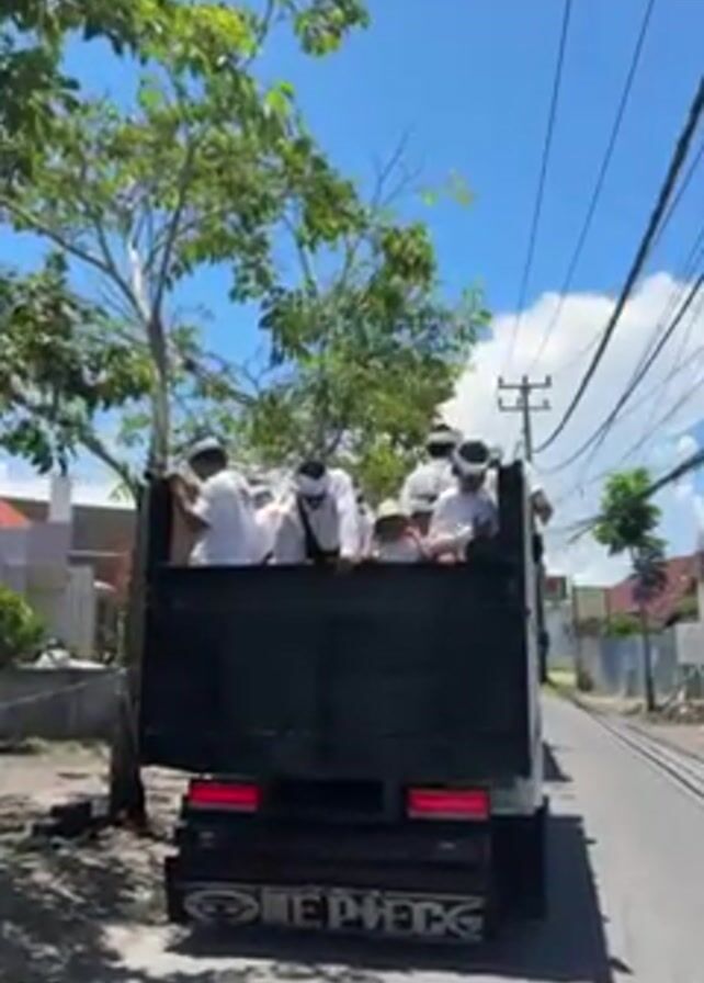 A dump truck with approximately eight people is seen moving down a road on a sunny day. The people are wearing white clothes and hats. The dump truck is black and has writing on the back. The road is paved and there are trees and buildings on either side of the road. A person on a scooter is visible in the bottom left of the frame.