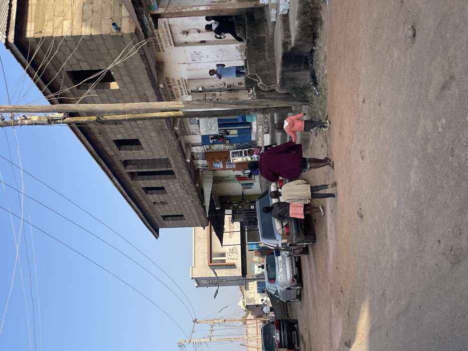 A street scene presents buildings of varying heights, some under construction, alongside parked cars. People, including children, stroll along the sidewalk, while others stand in doorways. Power lines crisscross the sky above the buildings. The scene captures the bustle of daily life in a residential or commercial area.
