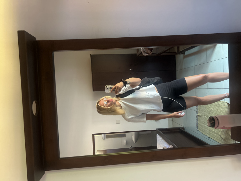 A full-body mirror selfie of a woman with blonde hair and glasses