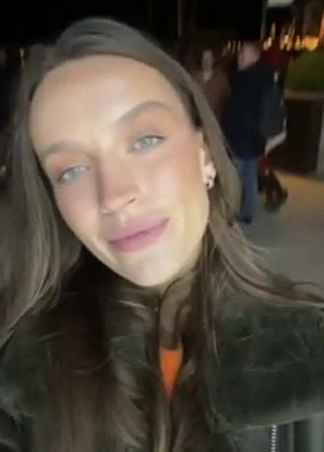 A woman is standing outdoors at night. She has long brown hair and blue eyes. She wears a dark jacket with faux fur and an orange shirt underneath. The background includes streetlights, trees, and people walking.