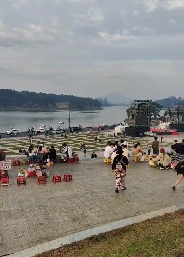 The video depicts a lakeside scene where people are sitting on small red and yellow stools, possibly eating or socializing. A woman in a patterned outfit and backpack walks across the paved area where the stools are scattered. In the background, there is a lake with a structure resembling a stage or platform on the water. Other people are visible in the distance along the lakeside. The weather appears overcast. The foreground consists of a grassy area.