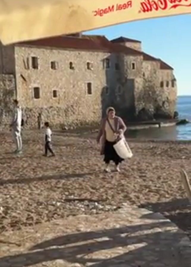 woman walking on a beach, with a stone building and the ocean in the background. The woman is wearing a head covering, a long cardigan, and a black skirt. She is carrying a white bag. A child and a man are standing in the distance. The camera is positioned under a Coca-Cola branded umbrella, offering a partial view of the scene. The beach appears to be sandy with some pebbles, and the sky is clear and blue. The stone building resembles a castle or fort, situated on the edge of the beach where it meets the water.