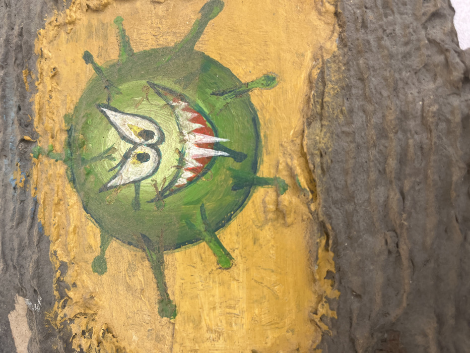 The image displays a hand-painted depiction of a cartoonish, menacing green spherical creature, resembling a virus or germ, situated on a highly textured, irregular substrate
