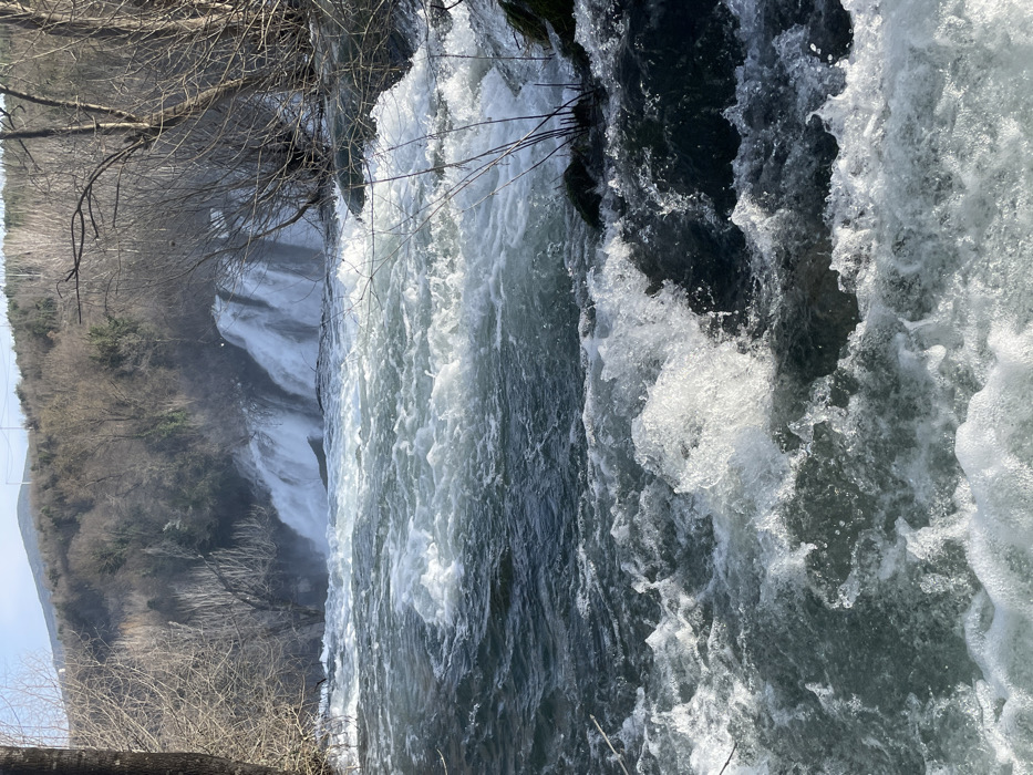 The scene depicts a natural river landscape in Studenci, Bosnia and Herzegovina. The foreground is filled with fast-flowing, turbulent water, dark blue-green in deeper sections and extensively frothing white where it forms rapids and breaks over unseen obstacles. Sparse, bare tree branches extend from the right bank into the water. The midground features a prominent series of multiple wide waterfalls, with white water cascading over a broad, multi-tiered rock formation, generating a visible mist. Surrounding the waterfalls and riverbanks are numerous deciduous trees and shrubs, primarily bare of leaves. In the background, a forested hillside or mountain rises, topped by visible utility lines. The sky above is clear and bright blue. No human subjects or animals are present.