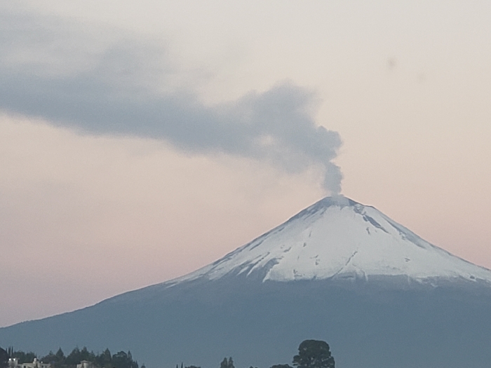 - "The image presents a panoramic view of a snow-capped stratovolcano, Popocatépetl, actively emitting a plume of light gray smoke and ash from its summit crater" by FM-zKXAq1, licensed under CC BY 4.0