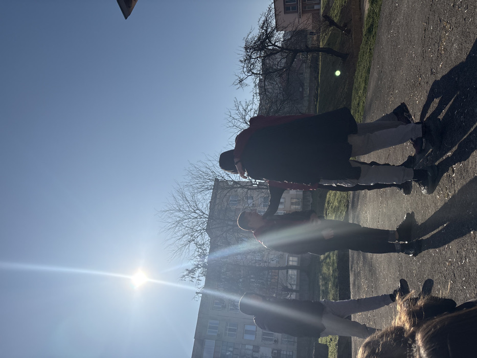 The image captures an outdoor scene in Cherven Bryag, Bulgaria, under a clear, bright blue sky with a prominent sun flare originating from the upper left. Approximately six individuals are present. In the lower-left foreground, the upper body and dark hair of one person are partially visible. Centrally, five individuals, primarily young males, are gathered on a dark paved surface that exhibits long shadows cast by the sun. From left to right within this group, one male wears a dark hooded jacket and light grey sweatpants. Next to him, another male in a dark jacket over a red garment extends his right arm to rest on the shoulder of a male standing with his back to the camera, who wears a long black coat over a red item, light grey pants, and dark sneakers. This central figure has his left arm around the shoulder of another person to his right, who is partially obscured and also has an arm around the central figure. A fifth, partially visible individual is positioned to the far right of this central interaction. In the midground, bare deciduous trees and grassy areas are present. The background features multi-story residential buildings with multiple windows to the left and a building with a pitched roof to the right.