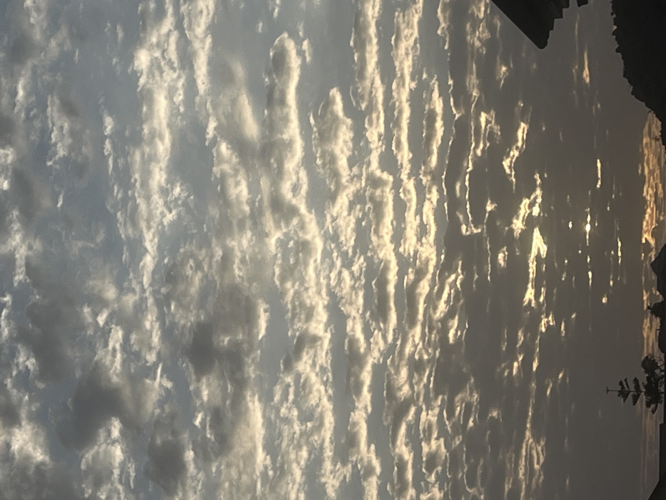 A sky filled with stratocumulus clouds dominates the frame, illuminated by a setting or rising sun. The clouds display a linear, rippled texture, casting shadows that contrast with the golden light breaking through. Silhouettes of trees and a building edge are visible in the lower right, suggesting a landscape beneath the expansive sky. The image is rotated, presenting the sky vertically.