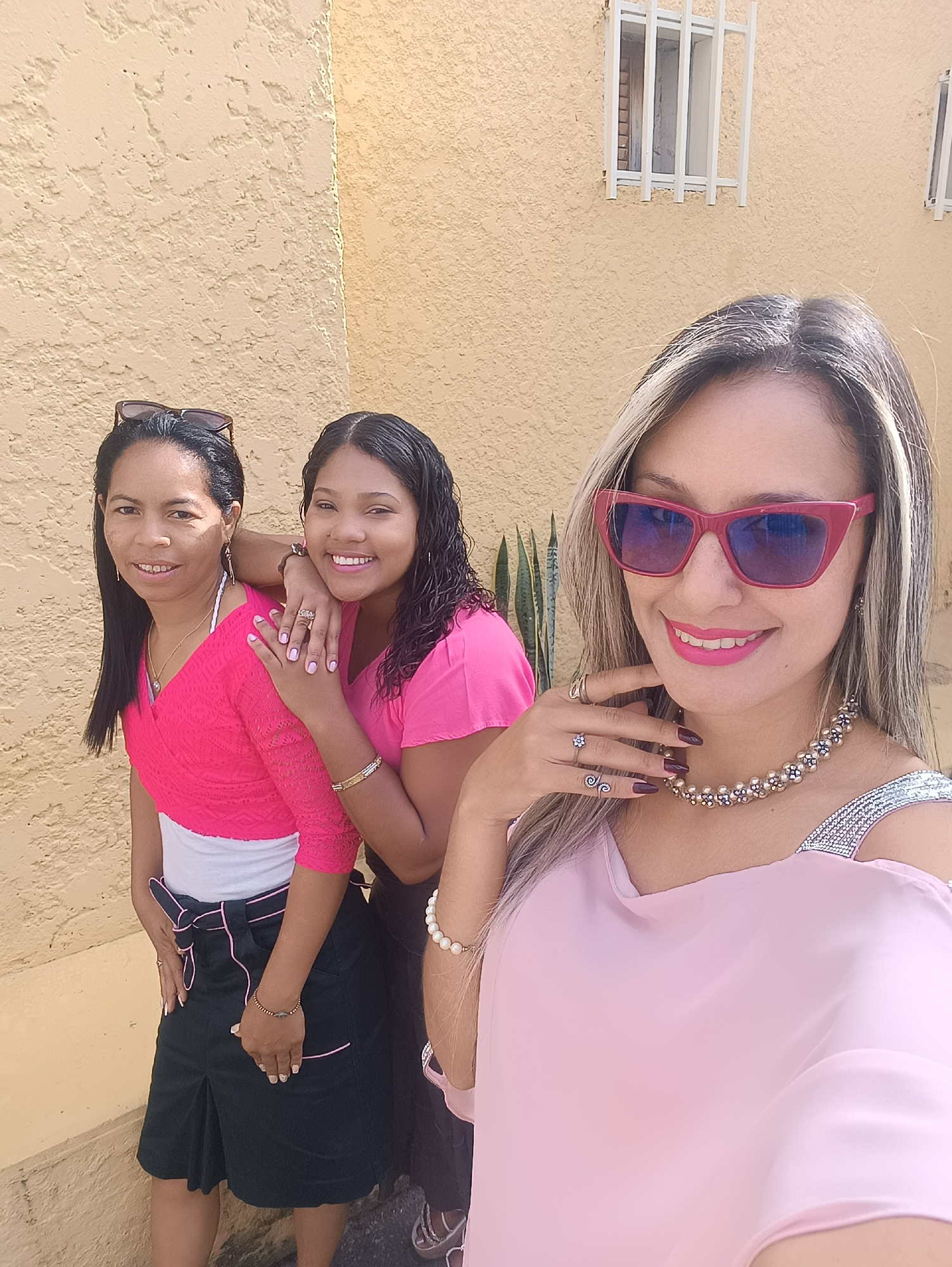 Three adult females are depicted outdoors in Las Tejerías, Venezuela, posing for a photograph against a textured, light yellow stucco wall. The woman on the far left has dark hair, with sunglasses resting on her head. She wears a white top beneath a fuchsia pink, lace-textured, long-sleeved wrap top and dark knee-length bottoms with pink trim. She smiles faintly, with her right arm around the shoulder of the central woman. The central woman has dark curly hair and wears a fuchsia pink short-sleeved top. She is smiling broadly, with her left arm around the shoulder of the woman on the left, and her right hand resting on that woman's left shoulder. She wears rings and a bracelet. The woman in the foreground on the right, appearing to take the photograph, has long, light-colored hair with highlights. She wears red cat-eye sunglasses with dark lenses and a light pink top featuring a sequined or embellished strap on her right shoulder. She displays a broad smile with fuchsia lipstick and wears a prominent pearl and floral-motif necklace, along with multiple rings on her right hand and dark nail polish. In the background, two small windows with white security bars are visible in the upper right portion of the wall. Green, vertical plant foliage is partially visible behind the central woman's left shoulder.