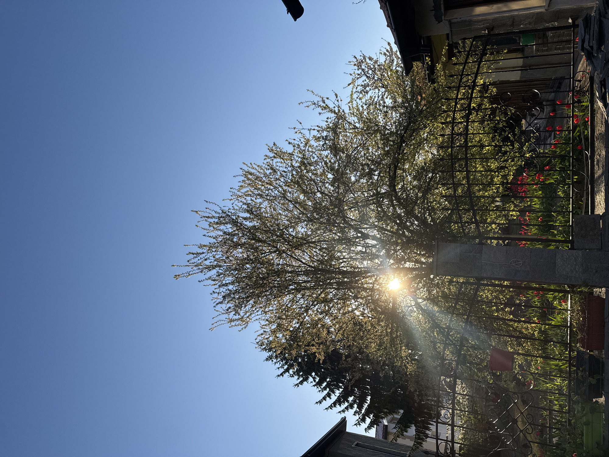 The photograph depicts a sunny scene in Dimitrovgrad, Bulgaria. The sun shines brightly through a tree, creating rays of light. A black wrought iron fence stands near the tree and encloses a garden with red tulips. The sky is a clear blue. A building is visible at the bottom of the image.