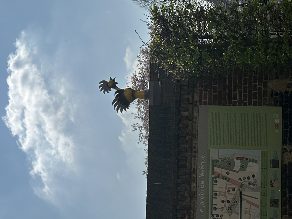 The image depicts an outdoor scene in Le Jardin de l'évêque (The Bishop's Garden) in Beauvais, France, under a partly cloudy blue sky. A stylized, golden rooster sculpture, rendered in a spiky, metallic form, is prominently positioned on top of a dark brick wall that traverses the middle ground. Behind the wall and the sculpture, pink blossoms of trees are visible, suggesting a spring setting. To the right of the frame, a dense, leafy green bush or small tree partially obscures the lower section of the wall. On the lower left section of the brick wall, a rectangular information panel is affixed, featuring a map of the garden and explanatory text in French, with "Le jardin de l'évêque" clearly visible as its title. No people or overt actions are present in the static scene.