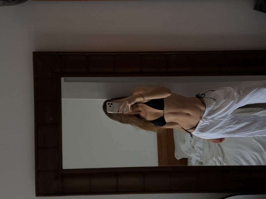 A mirror selfie shows a woman wearing a black bikini top and white pants