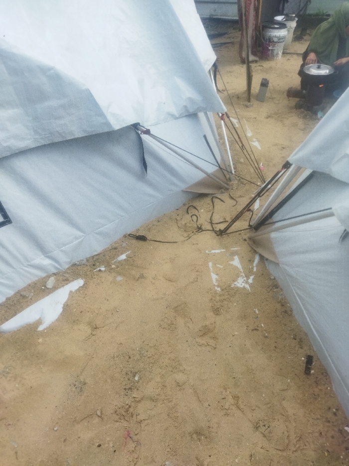 The image displays a sandy outdoor area in Khan Yunis, Palestinian Territory, featuring multiple temporary shelters