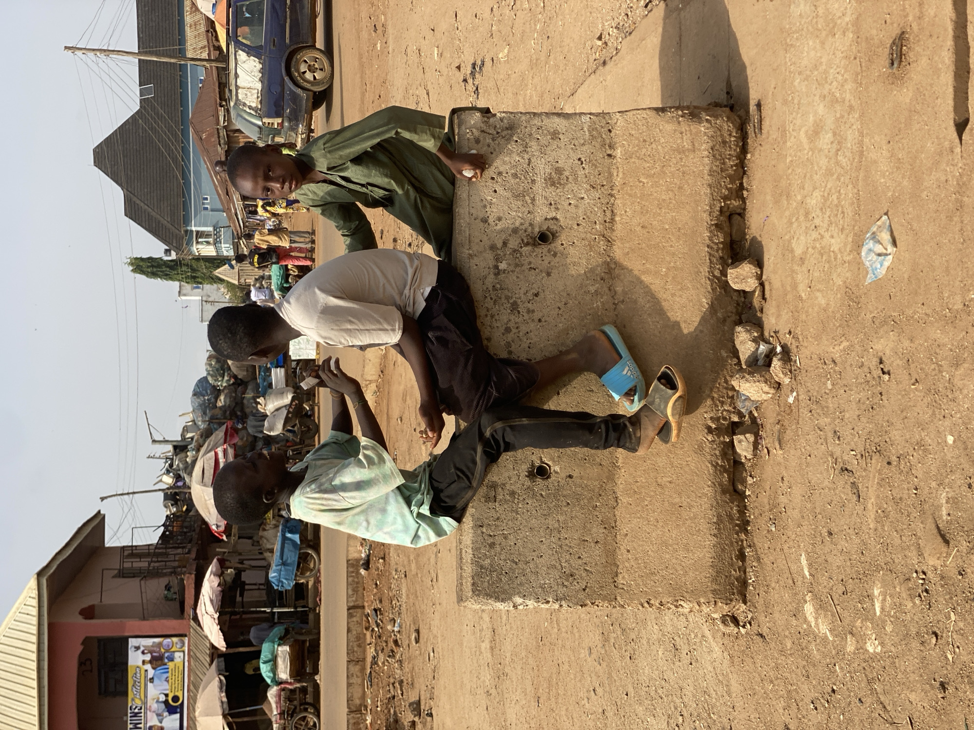 Three young boys are interacting with a large, concrete block situated in an outdoor environment with visible elements of an urban setting in Kafanchan B, Nigeria. The boy on the left is wearing a light green tie-dye shirt and black pants, holding something in his hands and looking upwards. The boy in the middle is in a white shirt and black shorts, leaning on the concrete block. The boy on the right is wearing a green shirt and is also leaning on the block. The surface surrounding the block is dirt or soil, with scattered debris and rocks. In the background, there are buildings, vehicles, and other people, indicating a busy, populated area.