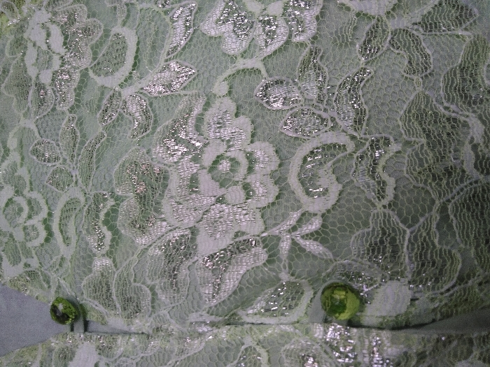This image, observed in Pokhara, Nepal, provides a detailed close-up of a light green lace fabric. The textile exhibits an intricate floral pattern, with many of the leaf and petal motifs outlined and filled with a shimmering silver metallic thread or reflective material. The base lace structure is a fine, light green net. On the left side of the frame, two distinct, round, translucent green buttons are visible, vertically aligned on what appears to be a narrow fabric placket. These buttons possess a smooth, slightly faceted appearance. The scene focuses exclusively on the texture and design of the fabric, with no other environmental details, people, or actions discernible.