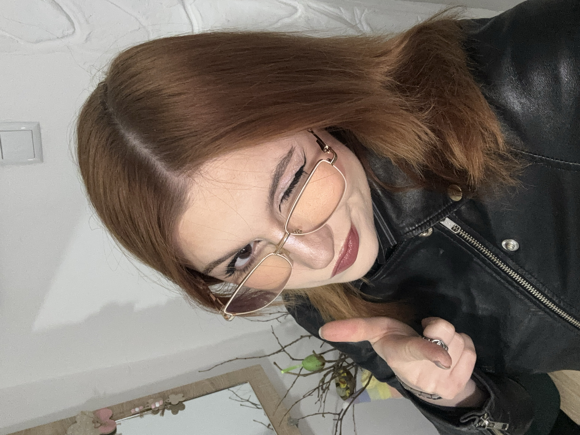 A young woman with reddish-brown hair, wearing a black leather jacket and eyeglasses, is facing the camera at an angle. She has on makeup, including eyeliner and lipstick. She is holding out her hand, as if reaching towards the viewer. The background includes a white wall and a decorated branch with a green object on it. A mirror is visible in the background. This image does not provide enough information to ascertain a location in Varna, Bulgaria.