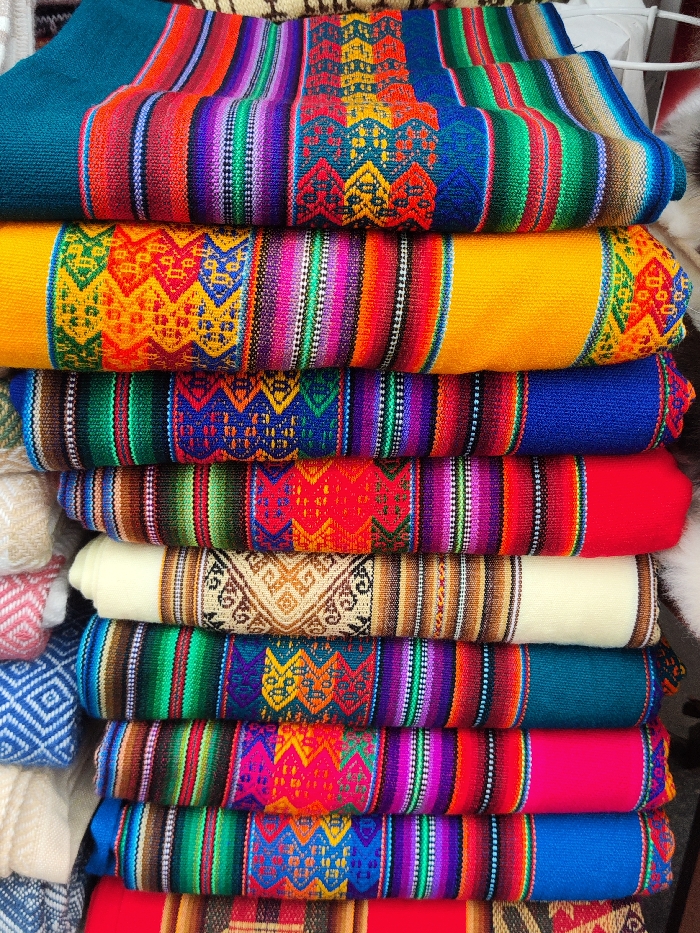 - "A stack of folded, brightly colored textiles with intricate woven patterns" by FM-20kwN2, licensed under CC BY 4.0