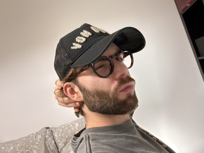 A male individual is depicted indoors, framed from the chest up, against a plain, light-colored wall. He is wearing a dark, trucker-style baseball cap with light-colored, textured "MON AMOUR" lettering on the front, and round, tortoise-shell patterned eyeglasses. His facial hair includes a full beard. His head is tilted backward and to the left, with his gaze directed upwards and to the right. His right hand is positioned on the back of his head, with fingers lightly curled. He is wearing a grey t-shirt. A dark, multi-compartment shelving unit is partially visible on the far right edge of the background. The specific location within Chambœuf, France, is not discernible from the image.