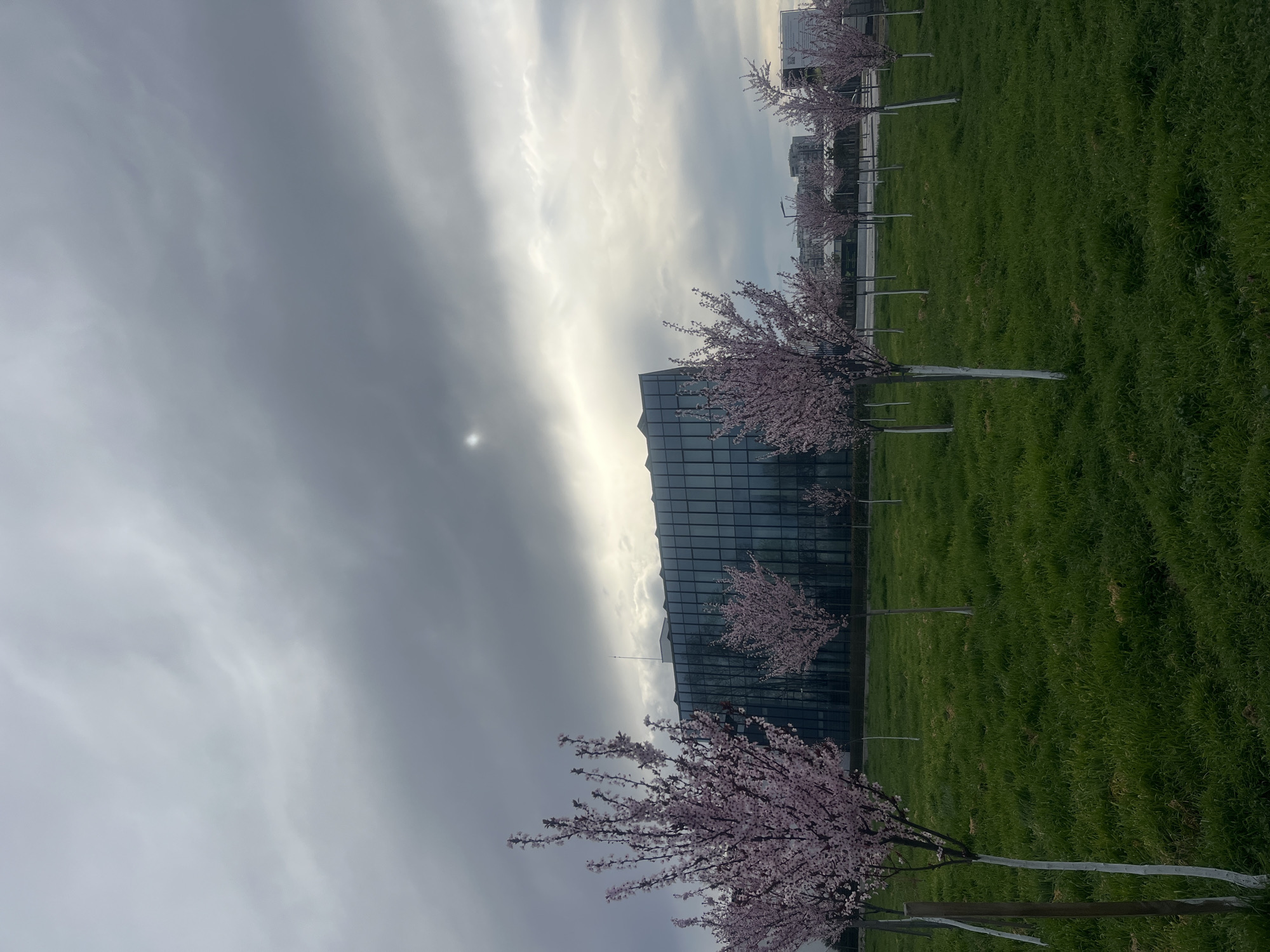 The scene depicts a landscaped green space in Plovdiv, Bulgaria, under an overcast sky. The foreground and midground feature an expanse of vibrant green grass. Numerous young deciduous trees, characterized by light pink blossoms indicating spring, are planted in rows across the lawn. The lower sections of the tree trunks are painted white, and several trees are supported by wooden stakes. In the background, a multi-story building with a dark, reflective glass facade and an angular architectural design stands prominently. Further back, an urban skyline with various buildings and infrastructure, including a dark fence and what appears to be a street or road, is visible. The sky is largely covered by grey clouds, with a brighter, lighter grey area in the mid-distance suggesting an obscured sun. A small, circular bright spot, possibly a lens flare, is present in the upper left quadrant of the sky. No people or active elements are observed.