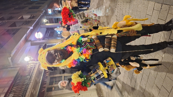 A person dressed in a Pikachu hood and a lei stands on a city street. He holds a bouquet of colorful artificial flowers. A tray of goods sits in front of him, including toys and decorative bangles. Buildings line the street, and streetlights illuminate the scene. Other people can be seen in the background.
