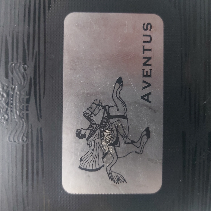 The image depicts a close-up, top-down view of a dark-colored object, likely a container or packaging, featuring a prominent metallic label. The object's main body is dark, possibly black, with a textured surface characterized by horizontal raised ridges. At the very top, a partially visible, dark, embossed emblem or crest featuring wavy lines and a central motif is present. Centered on this dark background is a rectangular, silver-toned metallic label with rounded corners. The label displays a black outline drawing of a man riding a rearing horse, facing towards the right. The rider wears what appears to be classical attire, including a flowing cape and a pleated tunic or skirt. Below and to the right of the horse figure, the word "AVENTUS" is printed in black, uppercase sans-serif letters. The metallic surface of the label exhibits numerous superficial scratches and scuff marks, particularly around the horse illustration, indicating wear. The image is a static close-up of an object and does not contain visual information to determine a specific location within Gimpo-si, South Korea, or any other urban environment. No people are visible beyond the depicted illustration. No specific actions or interactions are depicted apart from the static representation of a man on horseback.