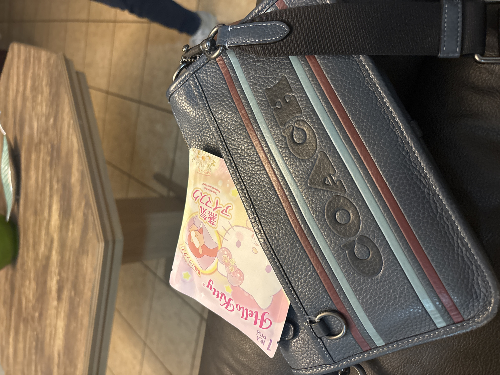 The image presents a close-up, downward-angled view of a dark blue, pebbled leather COACH-branded crossbody bag. The bag features an embossed "COACH" logo in a dark gray, positioned over three horizontal stripes: a central light blue-teal stripe bordered by two dark red-maroon stripes. A black fabric strap is attached to the bag via silver-colored metal hardware, and a silver-colored D-ring is visible on the bag's left side. Partially inserted into the bag is a pink and white "Hello Kitty" branded package, identified as a "Steam Eye Mask" by visible Japanese text ("蒸気アイマスク") and its English translation. The package illustration depicts Hello Kitty wearing a bow, alongside a cartoon figure with an eye mask on, resting on a pillow. Additional text includes "Hello Kitty," "1枚入" (1 piece), "PCS," and "おやすみラックス!" (Good night relax!). The bag rests on a dark, textured surface, consistent with upholstered furniture. In the blurred background, a light-colored wooden table with an octagonal or hexagonal top is visible, upon which a green, indistinct object rests. The floor beyond the table consists of light-colored square tiles. To the far right, the lower leg and foot of a person are partially visible, clad in blue pants and white sneakers. The specific location within the city of Puebla, Mexico, cannot be determined from the visual evidence present in the image.