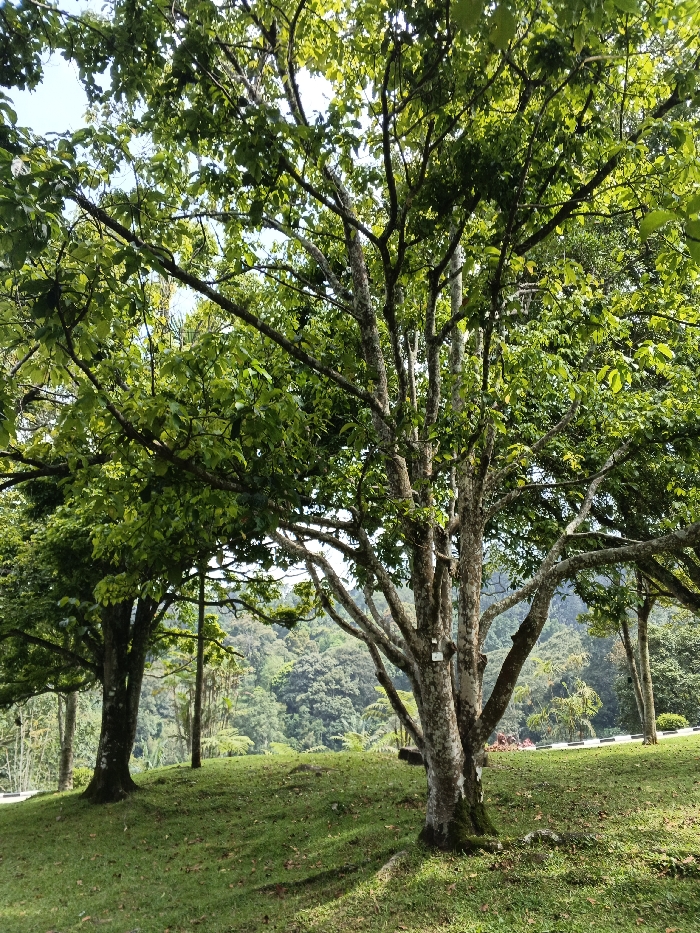 Lush greenery dominates the frame. Two prominent trees stand on a grassy knoll. The left tree has a dark, solid trunk and dense green foliage. The right tree exhibits multiple light gray trunks mottled with dark spots. Sunlight filters through the leaves, creating dappled shadows on the ground. A backdrop of dense forest extends into the distance, adding depth and perspective.