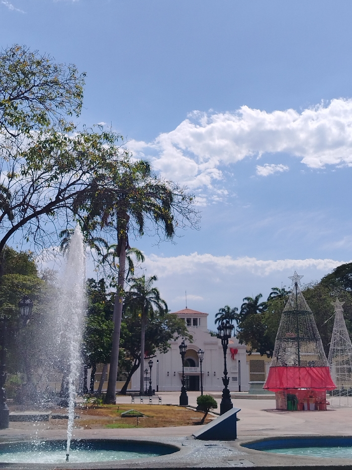A sunny daytime scene showcases a park with a central fountain. Tall palm trees and other greenery surround a light-colored building with a red-tiled roof. Decorative, illuminated Christmas trees with star toppers stand to the right. Classic-style lampposts line the area in front of the building. Fluffy white clouds dot the bright blue sky above.